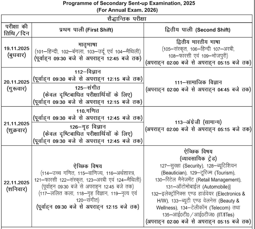 Board Bihar Board 10th Sent up Exam Routine 2026