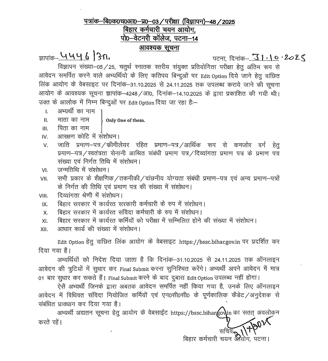 BSSC CGL 4 Form Correction Kaise Kare 2025 के लिए महत्वपूर्ण तिथि
