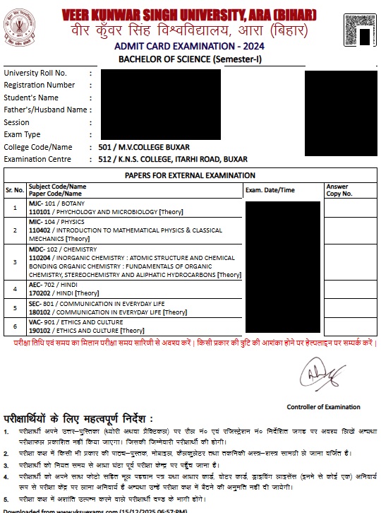 VKSU UG Semester 1 Admit Card 2025-29 : Overview